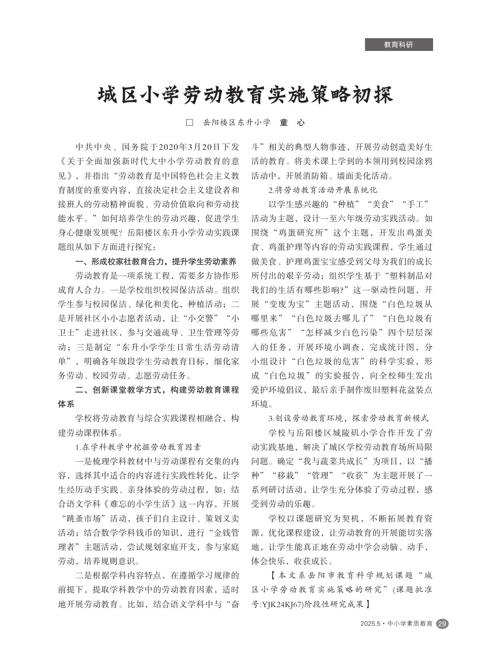 【2025年第5期】城区小学劳动教育实施策略初探
