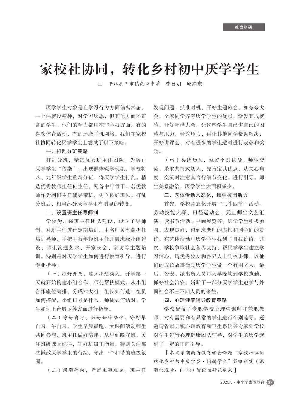 【2025年第5期】家校社协同,转化乡村初中厌学学生