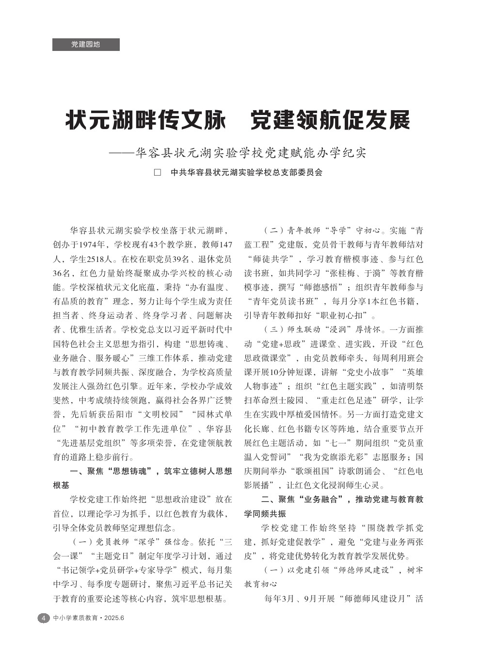 【2025年第6期】状元湖畔传文脉 党建领航促发展——华容县状元湖实验学校党建赋能办学纪实