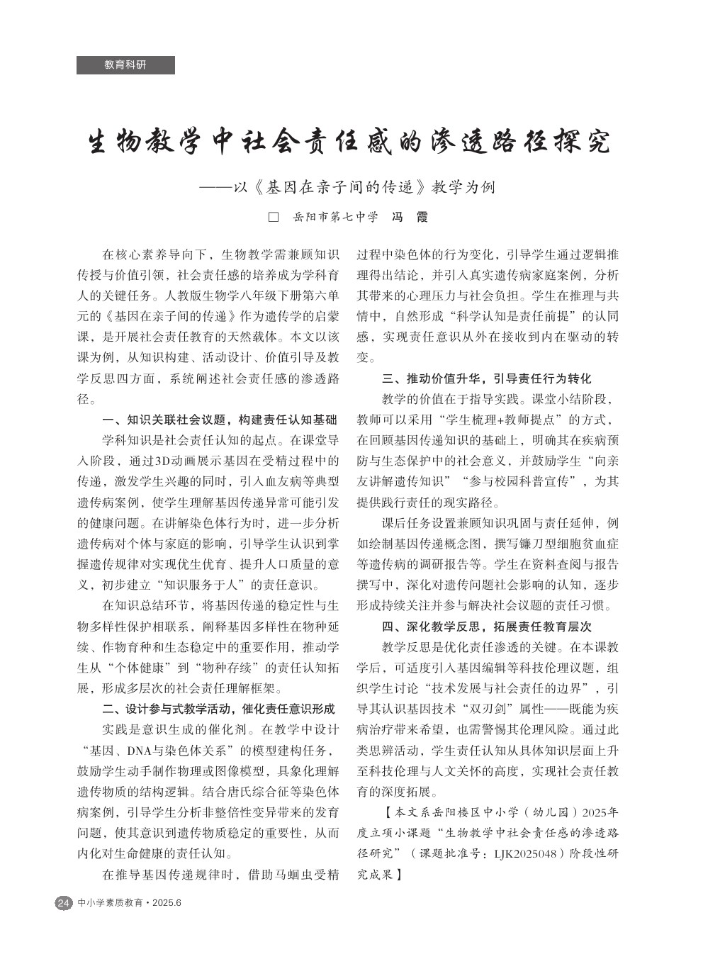 【2025年第6期】生物教学中社会责任感的渗透路径探究——以《基因在亲子间的传递》教学为例