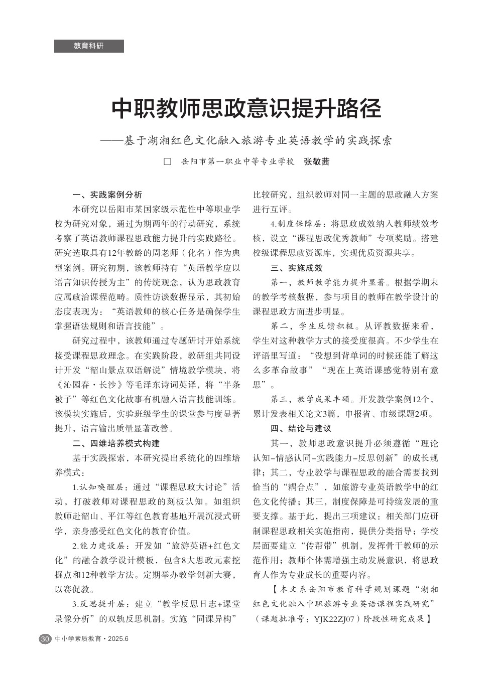 【2025年第6期】中职教师思政意识提升路径——基于湖湘红色文化融入旅游专业英语教学的实践探索