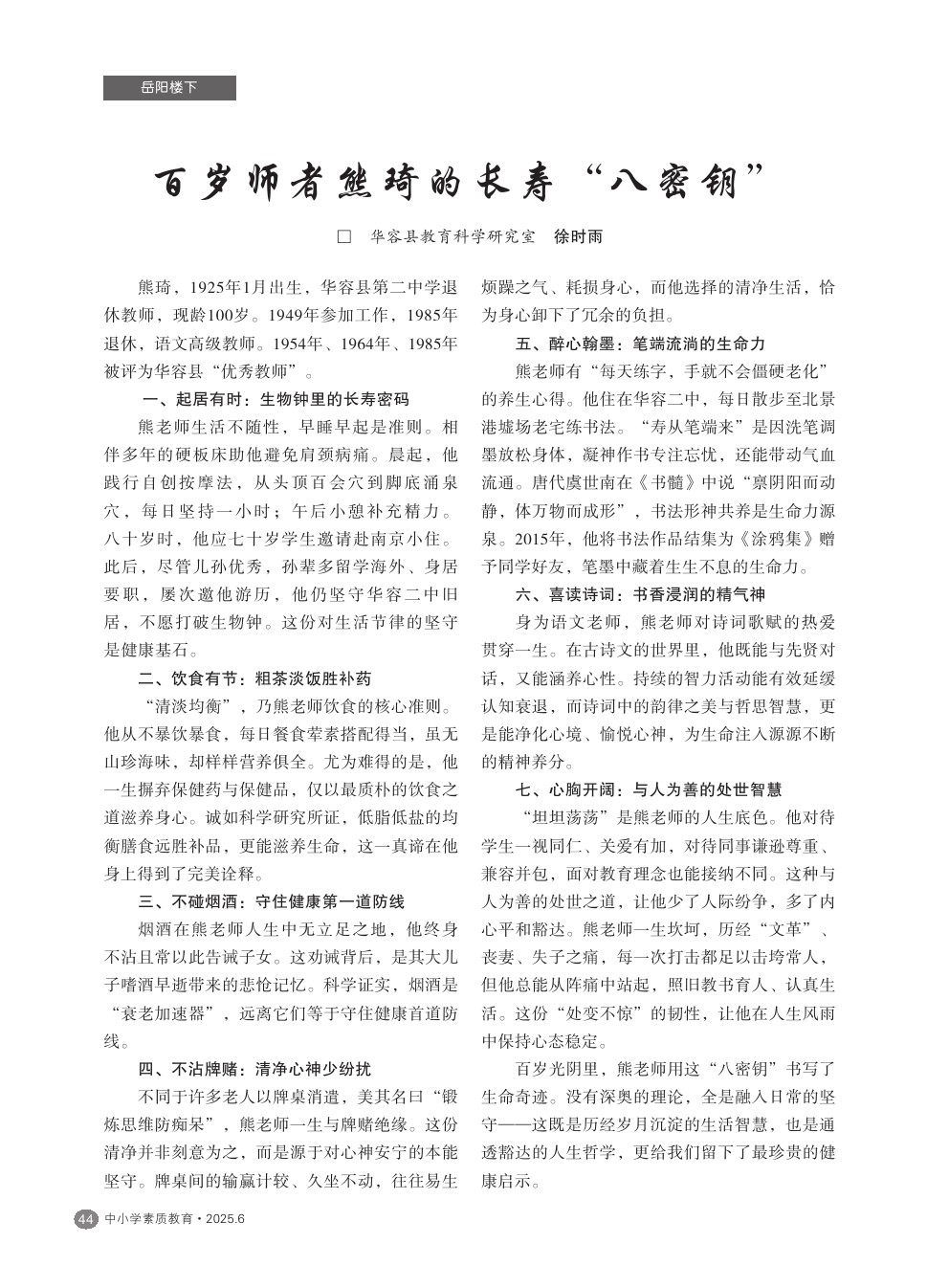 【2025年第6期】百岁师者熊琦的长寿“八密钥”