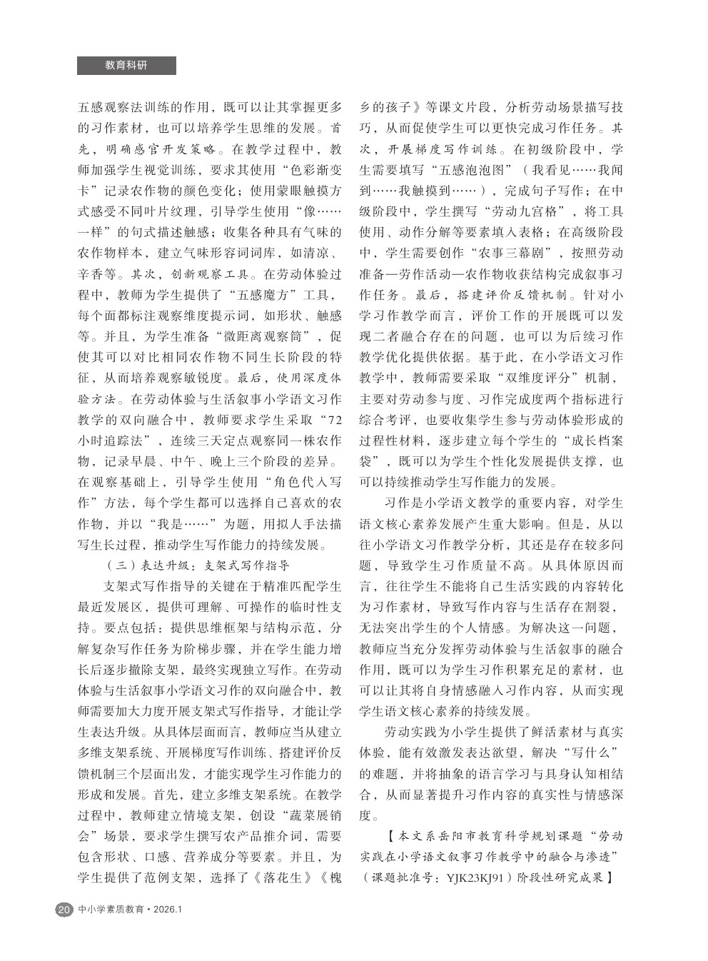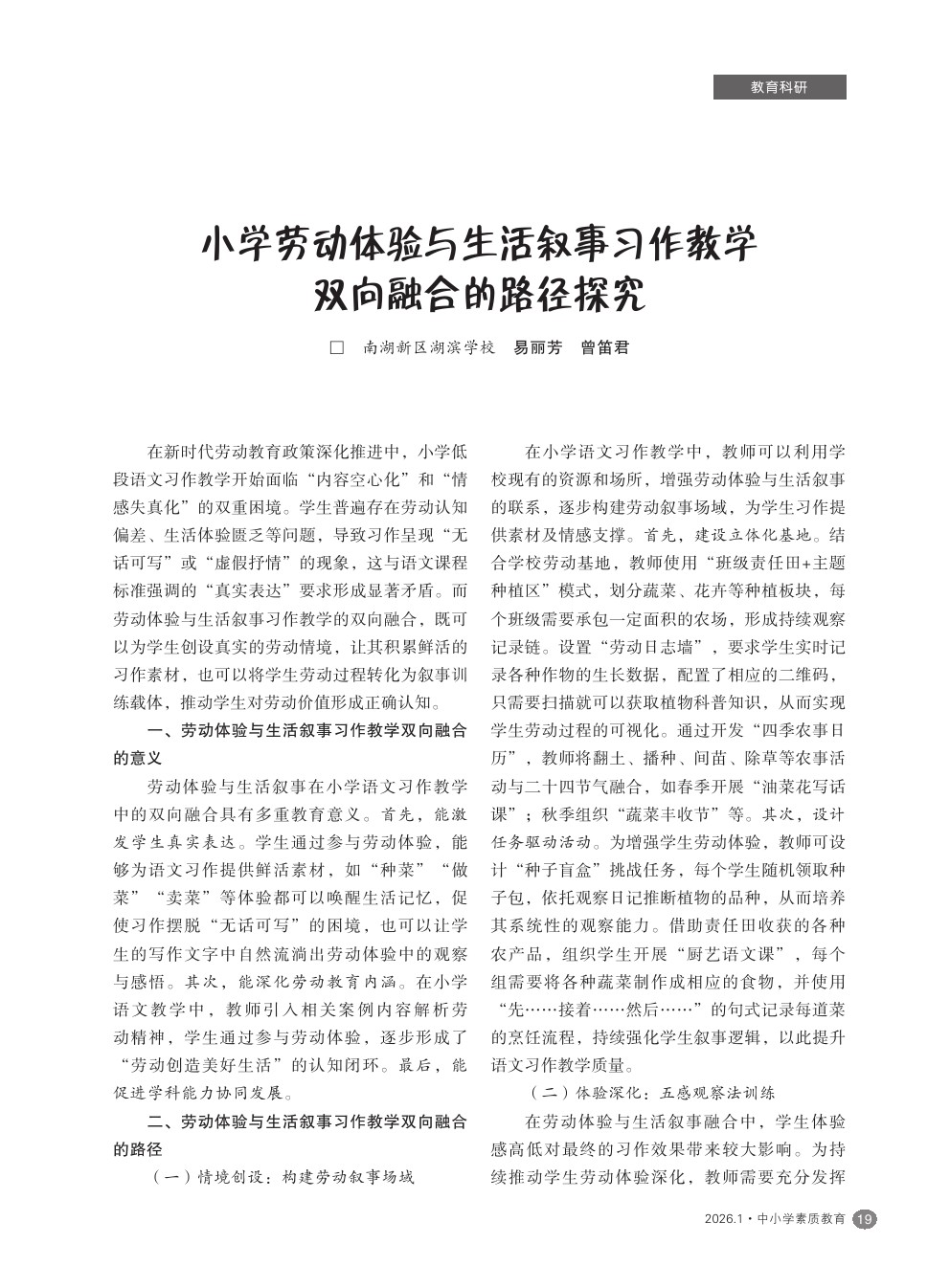 【2026年第1期】小学劳动体验与生活叙事习作教学双向融合的路径探究